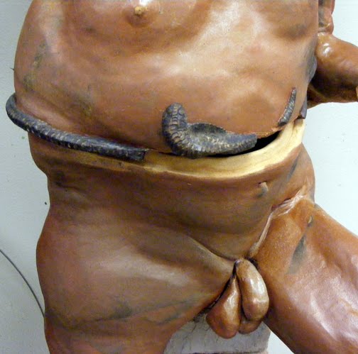 I spent the day gluing the parts which were broken off him during his greenware stage when a young student fell into him in February. He must be well built since only most of his trunk, his left hand, part of his left foot and parts of his belt broke off in the assault. sigh.